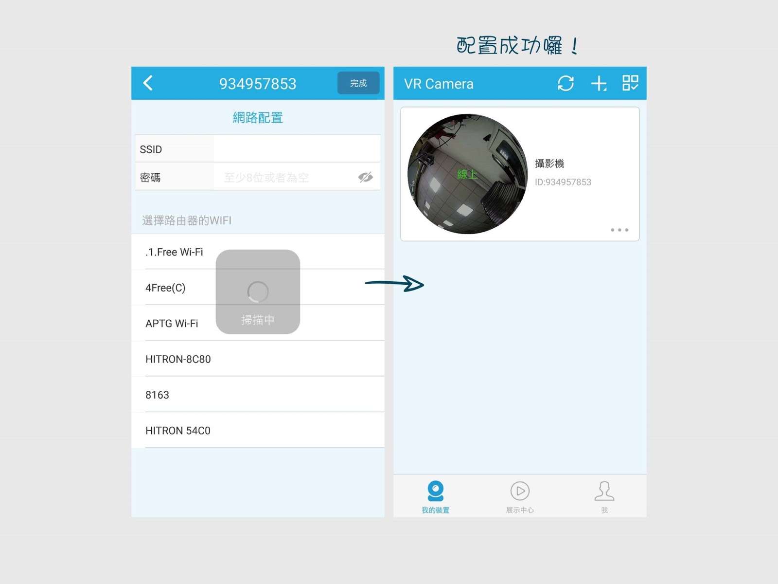 接著跳到公司或家裡的wifi新增欄位畫面,輸入wifi的ID及密碼,連接成功也會有語音提示,就會顯示圖片中最後一格的「線上」狀態,表示安裝已成功!