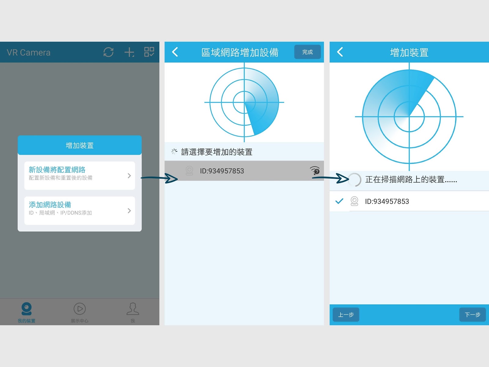 點選+號時,會跳出一個選擇畫面,第一次配置時要選擇第一個「配置設備網路」的按鈕,第二個「添加已聯網的設備」是已配置過、要再次配置才要選的紐。接著會搜尋到此台機器的ID,等待手機與機器連結,會有語音提示連結成功,按右上角的「完成」即可。
